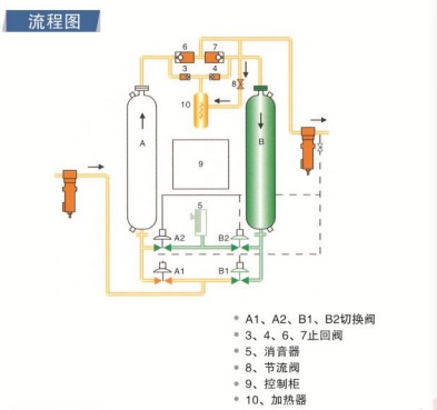 吸附:湿空气从下管系经A1阀进入A干燥罐体,自下向上流过吸附剂床,干燥后的空气从上管系排出。