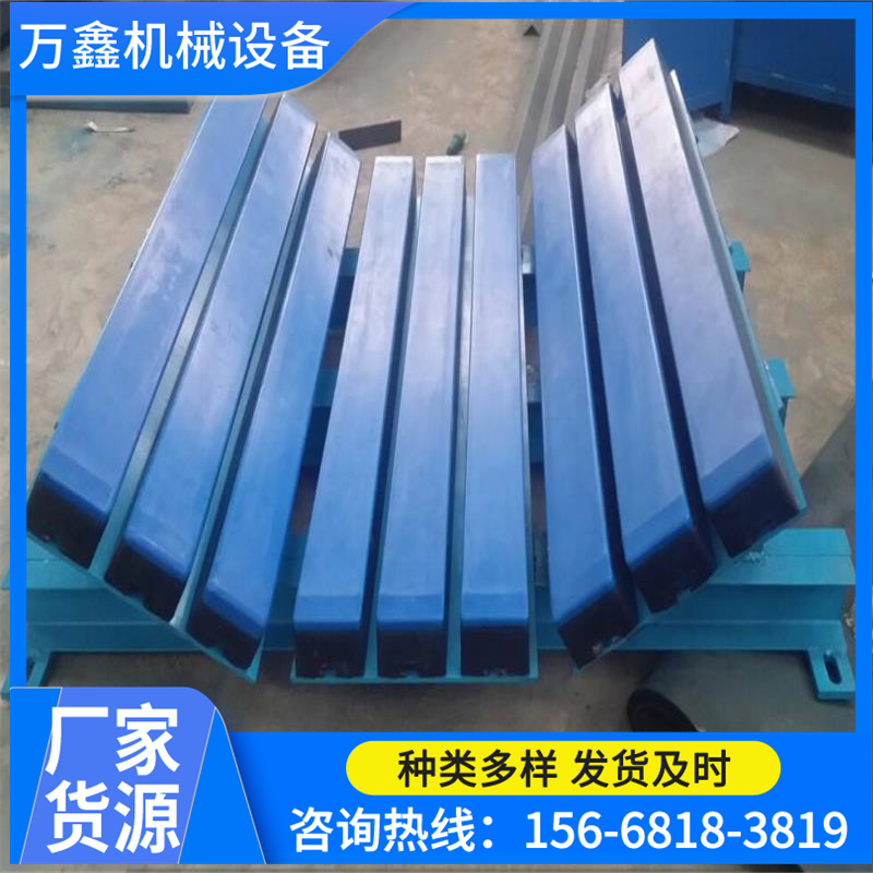 缓冲条 高分子 缓冲床 防撞橡胶缓冲床根据安装使用需求分为平行缓冲床、挂式缓冲床、下沉式缓冲床、大角度缓冲床;根据使用工况条件分为耐磨缓冲床和阻燃缓冲床,复合重载缓冲床、可调式缓冲床、重型缓冲床等等。因此合理选型就变得很重要,一般情况下都是根据不同的工况条件来一对一设计定制缓冲床,通过带宽、缓冲条长,有无阻燃要求,输送介质、落料高度、带速、介质颗粒直径、运输量等条件来选型。 缓冲床一般由缓冲条、缓冲条底部支撑、底座支撑三部分组成,还有一些是缓冲块、托辊等。但万变不离其宗,我们就大概来分析一下这三部分的质量问题: