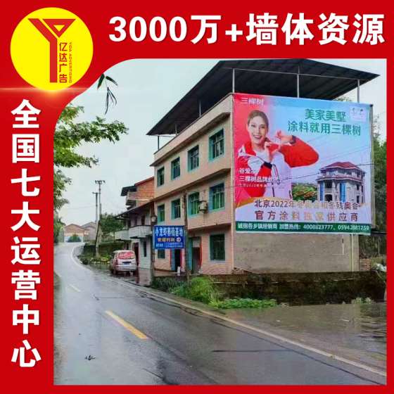 江苏南通墙体广告制作水泥喷绘墙体广告 覆盖25个省, 亿达墙体广告相信有一分耕耘,就有一分收获,团结一条心,石头变成金,多点沟通,少点抱怨;多点理解,少点争执。只要给职工提供良好的工作环境并相信他们,他们就能做好工作;拥有百折不挠、积向上的心态,坚毅和高尚的品格,面对困难、克服困难的勇气,是我们每位员工所需要的,在工作中面对种种压力时,要选择超越。墙体广告针对“上山下乡”的品牌在农村须有市场。中国的农村人口虽然号称八九亿,有着无限地市场潜力,但这并不能适用于所有的品牌,比如像各种产品在农村就卖不出去,这些品牌就没有必要来农村刷墙了。而像阿里巴巴、京东、当当、苏宁这些品牌当初之所在农村疯狂刷墙,就是因为农村网民在电商的使用上和城市网民一样活跃。其次,并不是所有的墙壁都可以用来刷广告。农村的墙壁是非常多的,但是墙壁好能在大路边上,交通便利,周围视野开阔,没有遮挡,这样才能使广告让更多的人看到。您值得信赖的农村刷墙广告公司,专注三四级城乡市场,品牌下乡整合营销专家,不仅可以发布全国的墙体广告,更有城乡户外牌、乡镇路演、门头店招等农村市场的渠道。作为户外广告的一种,墙体广告在位置地的选择过程中需遵循人流原则、视觉佳准则和综合平衡定律,比如位置优选与实地调查、综合评估等,做到大限度地传播广告信息。