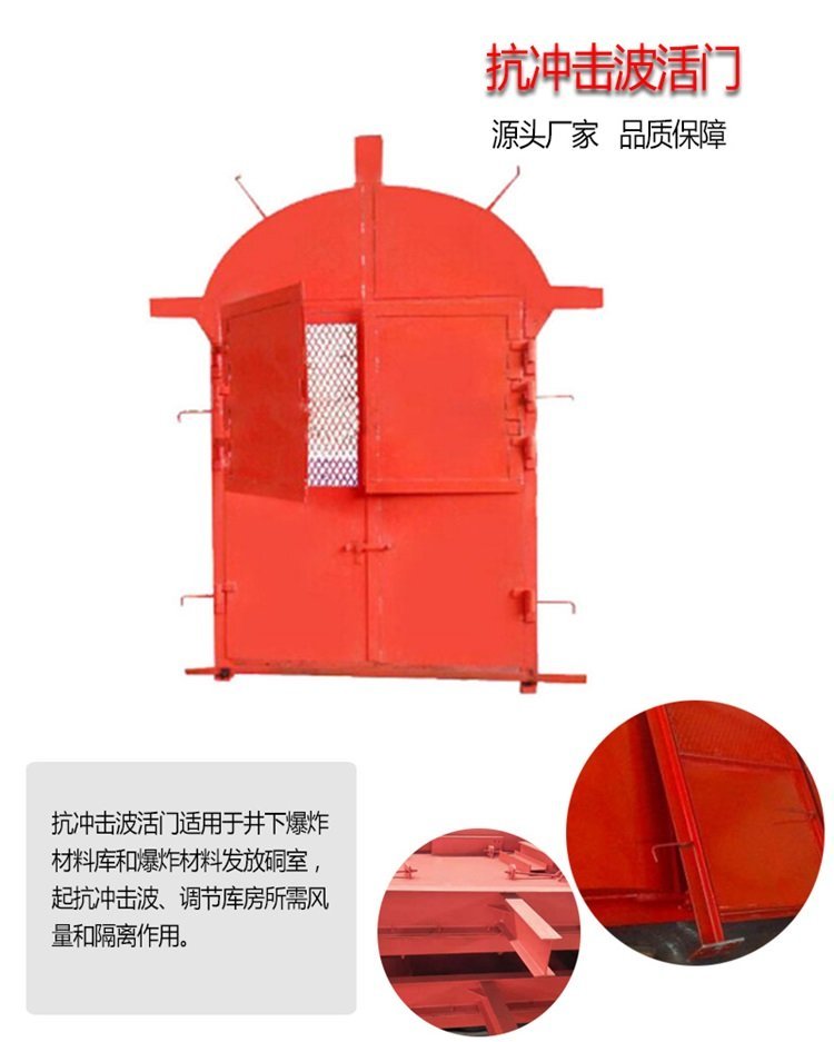 1、抗冲击波密闭门主要用于矿山井下爆破材料库和爆破材料发放硐室内;可以有效的防止炸药爆炸产生的火焰、浓烟、有毒气体向外扩散;抗冲击波以及调节库房所需通风量和库房内发生火情关闭通风孔,起到隔离作用。