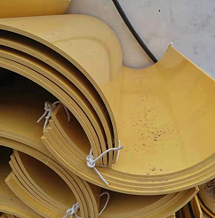 T型、圆弧型的,1.5m长,1m长,8mm厚度,颜色为huang色,表面光滑,四角有椭圆孔作为溜槽连接使用,1.5mT型溜槽重9.8kg,1m弧型溜槽重6kg。 溜槽规格很多,本公司可以根据使用者的具体情况定做,一般情况只要提供长度,弧长,厚度即可定做。