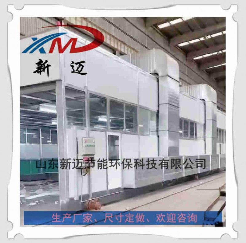 首先整体移动式喷漆房的设计是为了满足大批量大中型工件实现流水作业的需要而设计在一种全封闭可移动的喷漆房,通过设置可***在某一个区域形成一个局部喷漆工作间,而其他区域则可以继续进行工件的吊运、打磨和晾干工作。喷漆房主体为钢结构及阻燃复合板构建,美观大方、坚固***。房体立柱下面设置有电动驱动行走机构,可沿导轨行走。两端设有电动卷帘门,房体行走时大门升起,待***置时,大门降落关闭,大门的升降与房体行走电控连锁,安全方面。根据不同用户的具体需求和我们多年的实践经验而设计了如下几种漆雾处理器与喷漆房的组合形式。