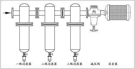 1. 安装时,必须按照过滤器上的空气进出口标签连接好管道。否则将进出口反装会严重影响过滤效果。为了便于使用和更换维修,过滤器应按下图所示的标准管线进行安装。