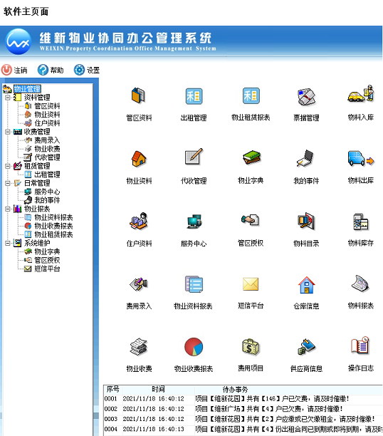 成都维新物业财务收费管理系统简介:针对物业公司的实际情况开发,软件功能涵盖物业公司日常收费、报修、物料、租赁、帐务管理工作全过程。适用于小区物业管理、写字楼物业管理、资产租赁管理、物业教学(培训)、物业收费管理、公寓管理、学校、园区、物业公司协同办公管理。软件功能模块有:资料管理、财务管理、手机子系统、报修、租赁管理、日常工作、行政办公、统计报表、基础数据管理、系统管理。软件自99年面市以来,已应用于全国3000多家企业,并得到用户好评。软件功能模块有: