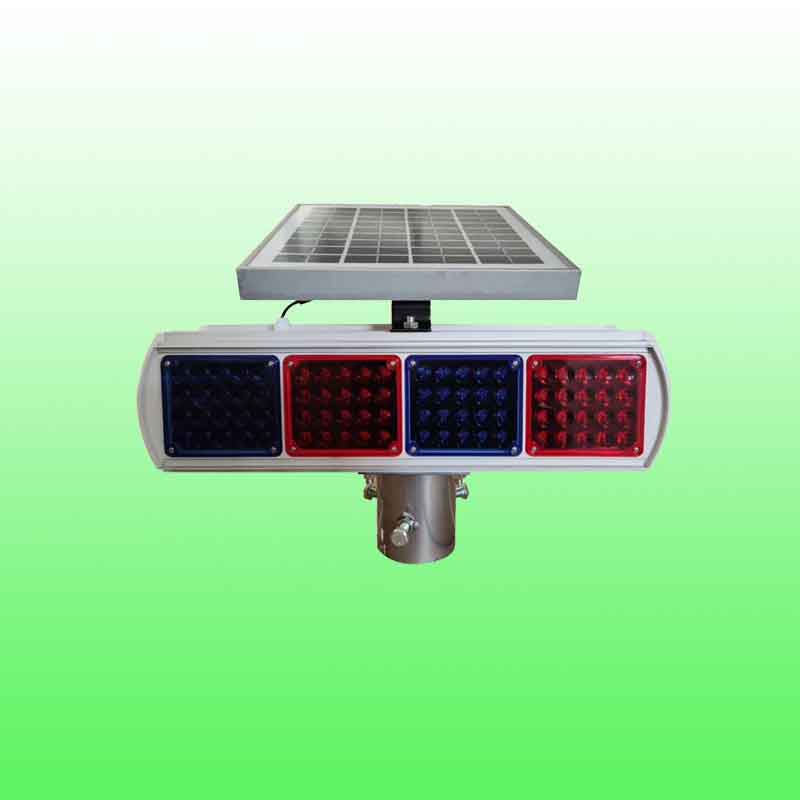 太阳能四灯爆闪灯特点:外壳由经氧化处理的铝型材组合,表面塑料喷漆,外观精美,长时间使用并不会出现锈迹斑斑,闪灯采用密封结构组合式灯组,每组20个超亮LED,真空镀膜反光板,亮度高,警示效果好,聚碳酸酯灯罩,抗冲击,耐老化,整灯的密封密封效果好,有很好的防水性,并配有过充电过放电保护功能。