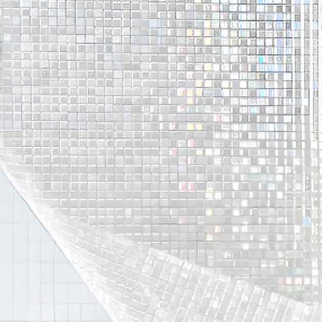 马赛克玻璃膜以玻璃为基料,呈乳浊或半乳浊状光泽,其断面通常为楔形,背面带有锯齿状沟纹,通过着色 - 烤干 - 切片 - 烧烤 - 退火 - 表面处理六项工艺制作而成。