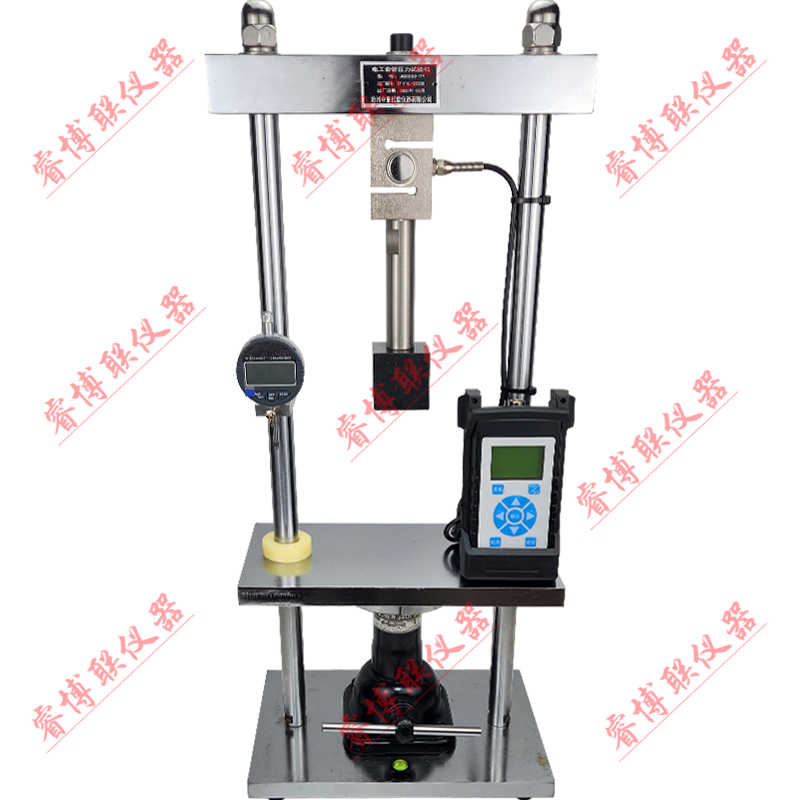 试验机由底座、液压机构、升降平台及百分表变形测量装置等组成。