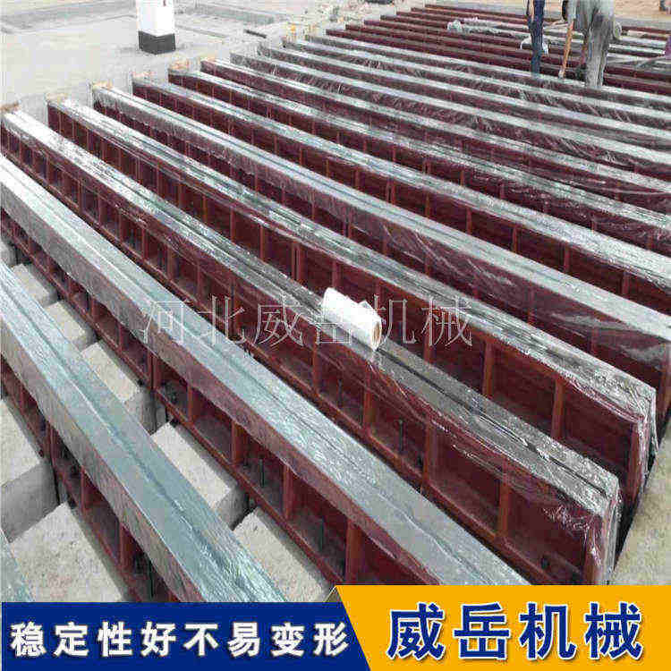 铸铁地轨--T型槽地轨主要用于大型设备的装配、试验、铸铁和检验.这样不用做成大型的平台,地轨具体规格可根据需方图纸制作或双方商定生产加工。根据设备的固定点来设计、拼接成铸梁平台。即节省了材料成本,又可以占用很小的空间,可谓是性价比很高。完全可以替代大型装配平台、铸铁平板、装配平板等,能够满足冶金设备、建材设备、矿山设备、造船等大型设备制造、组装、装配等工作。度铸铁HT200-300工作面硬度为HB170-240经过两次人工处理(人工退火600度-700度和自然时效2-3年)使该产品的精度稳定,耐磨性能好。铸铁地轨长度规格可以做成500mm4000mm以内的各种规格。外形尺寸、每米长度重量要根据客户要求承重来确定,威岳公司免费为客户设计图纸、提供前期服务!多年来,我公司以合理的、高品质的产品、周到的售后服务赢得了市场的信誉。同时为了方便用户,可根据客户要求加工订做各种铸件、非标准量具地梁、T型槽铸铁地轨、十字槽铸铁平台、铸铁试验平台等产品。
