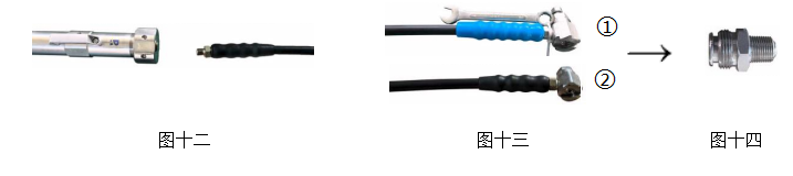 旋开注脂筒出脂端压盖处的注脂锥杆和注脂螺母,把外挂枪头油管的外丝M14*1.5旋入注脂筒出脂端原注脂锥杆的位置(见图十二),枪头与阀门或管道上的注脂阀平面槽相挂扣(连接图十三①和图十四或图十三②和图十四),如使用螺杆锁紧式外挂枪头需用配套的S16扳手把枪头上的螺杆给锁紧,各部件连接完毕后操作好手动试压注脂两用枪,直至密封脂或黄油注入,并达到所需压力。