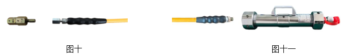 16、如注脂的空间不够或高度较高,可把包装箱内配备的一条黄色油管用上(旋开注脂筒出脂端压盖处的注脂锥杆和注脂螺母,把旋下的注脂锥杆和注脂螺母旋入黄色油管一头的内螺纹内(见图十),注意黄色油管内螺纹内需放入φ6的组合垫圈,黄色油管的另一头外丝M14*1.5旋入注脂筒出脂端原公接头的位置(见图十一),注意压盖里面的组合垫圈不要丢失,并保证旋紧无泄漏)。
