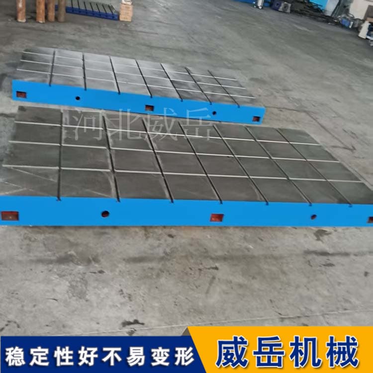 使用过程中的不当操作与环境影响是导致铸铁平台变形的常见诱因。长期超负荷使用是主要原因之一,当承载重量超过额定载荷的120%时,平台材料会在压力下发生塑性变形,例如2000×3000mm规格的平台(额定承载50吨),长期承载60吨以上重物,3-6个月就可能出现0.1mm/m以上的变形^。安装与搬运过程中的失误也会造成变形,如支撑不平衡、固定不牢固,或搬运时受到撞击、不均匀支撑,都会破坏铸铁平台的平整度与结构稳定性。http://www.chinaweiyue.com/此外,环境因素的影响不可忽视,铸铁的线膨胀系数约为11.5×10⁻⁶/℃,温度剧烈波动会导致平台整体或局部尺寸变化,长期反复热胀冷缩会使材料产生疲劳变形;湿度过高或存在腐蚀性物质,会导致铸铁表面氧化腐蚀,进而影响平台的稳定性。