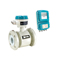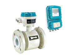 分体管道式电磁流量计由流量传感器和转换器两大部分组成。测量管上下装有励磁线圈,通励磁电流后产生的磁场穿过测量管,一对信号电极装在测量管内壁与液体相接触,产生感应电势,将流量信号传送到转换器。